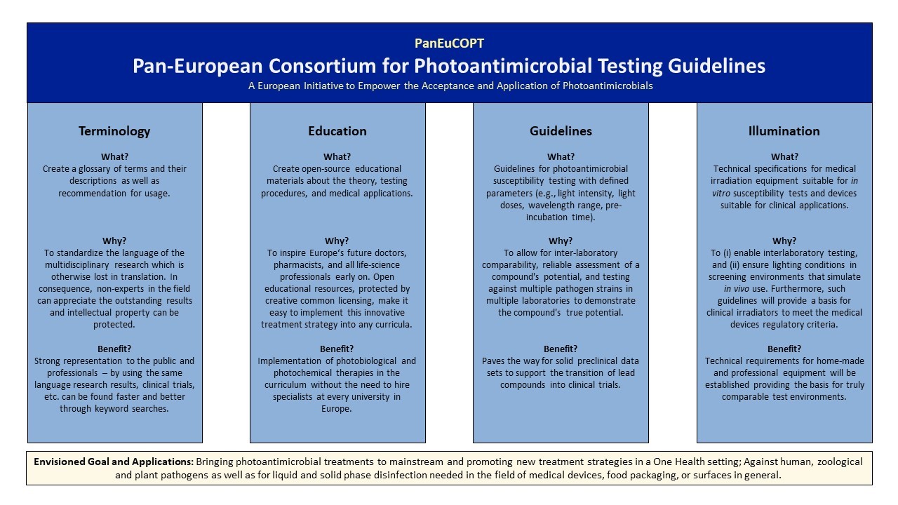 The new COST Action PanEuCOPT (CA24127), funded by the European Union with approximately €600,000, addresses the critical challenges by uniting European scientists from multiple disciplines - including photobiologists, microbiologists, pharmacists, physicists, and medical doctors - alongside industry representatives. Over the course of four years, this collaborative network will develop binding guidelines that encompass standardized testing protocols, illumination device specifications, educational materials, and terminology. The ultimate goal is to advance [Photodynamic Inactivation] of microbial pathogens toward clinical trials and regulatory approvals (Figure 1).